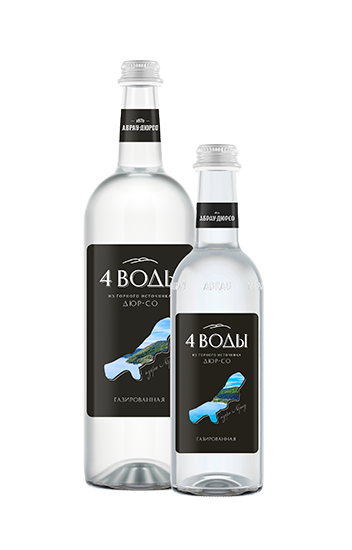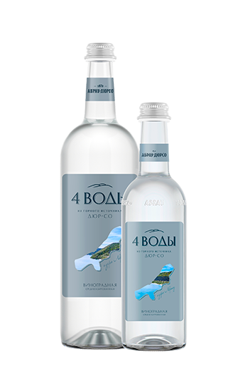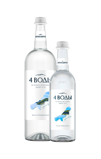 «4 воды» - природная питьевая вода от «Абрау-Дюрсо». По легенде именно из четырех источников берет свое начало горное озеро Абрау.