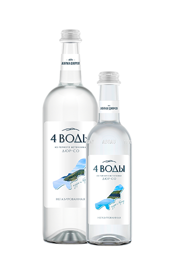 «4 воды» - природная питьевая вода от «Абрау-Дюрсо». По легенде именно из четырех источников берет свое начало горное озеро Абрау.